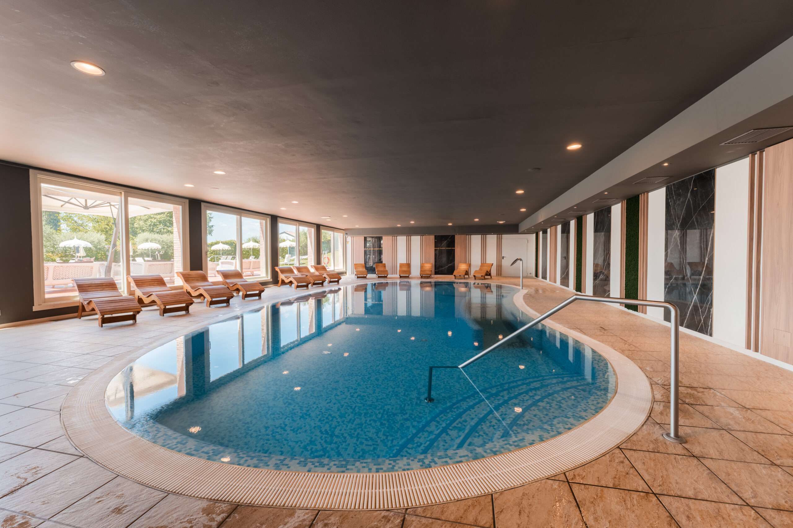 To make the experience even more special, the heated indoor pool has been elegantly refurbished with fine marble, moss-covered walls that echo the surrounding nature, and warm wooden accents, creating an enveloping and harmonious atmosphere.